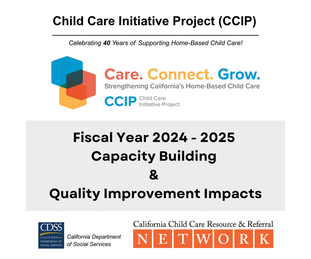 Since its launch in 1985, the Child Care Initiative Project (CCIP) has been implemented by Child Care Resource & Referral (R&R) programs across California to strengthen the home-based child care workforce. Now celebrating 40 years of impact, CCIP has been available in all 58 counties of our state since 2002— helping to recruit, support, and provide professional development opportunities for home-based child care providers. CCIP proudly serves both Licensed Family Child Care Home (FCCH) providers and LicenseExempt/Family, Friend, and Neighbor (LE/FFN) caregivers—especially those caring for infants, toddlers, and children in subsidized care.
